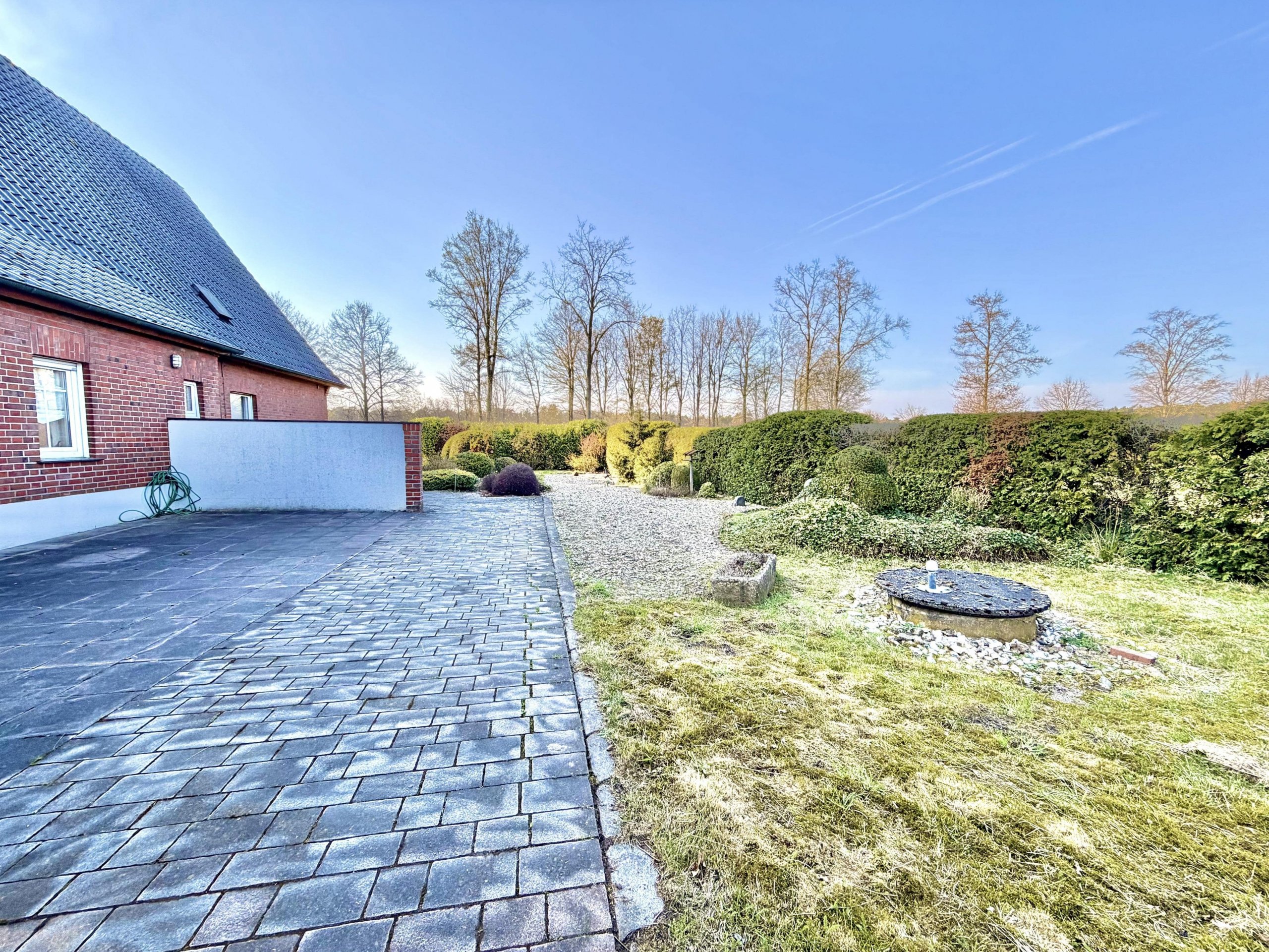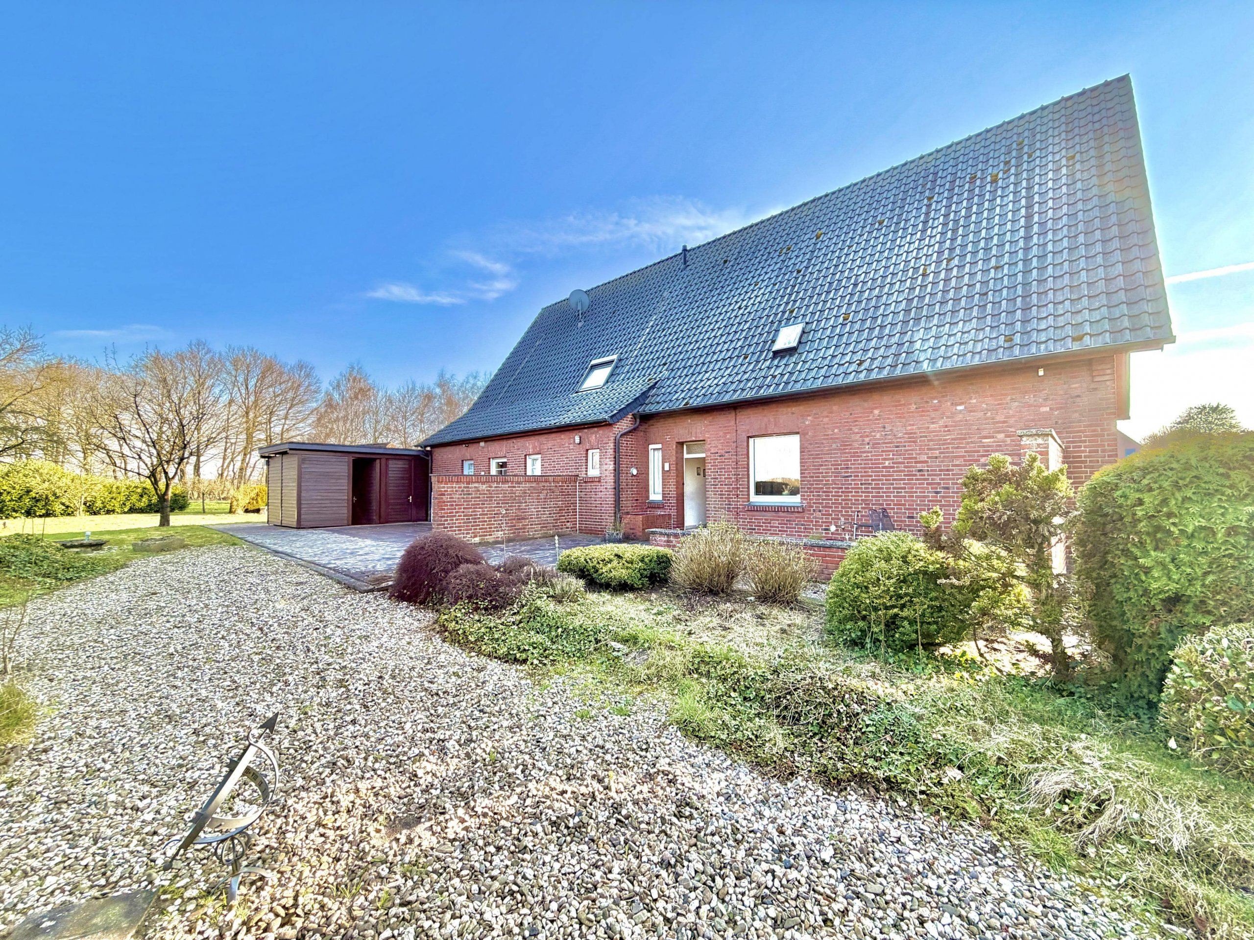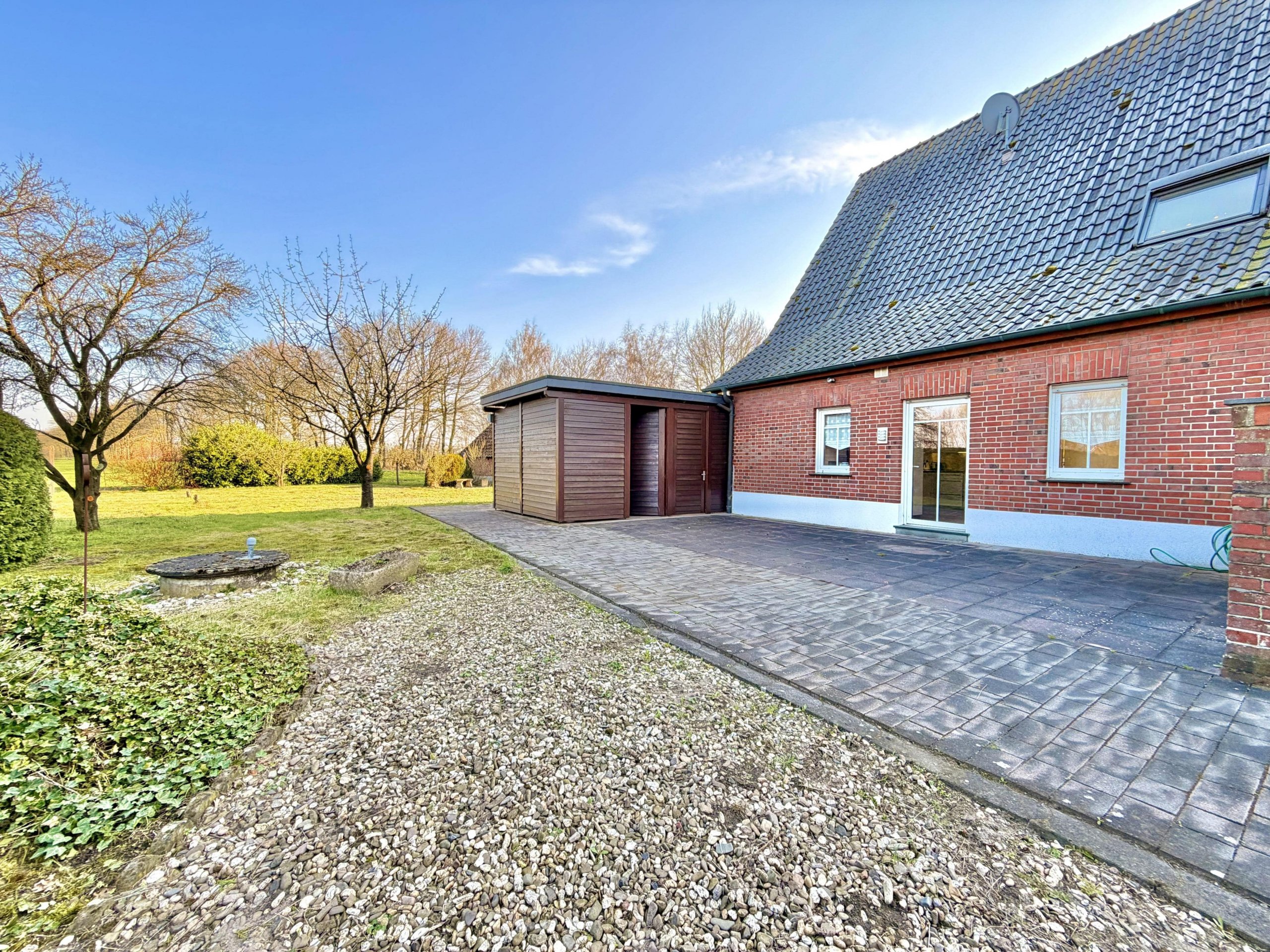 Die rechte Haushälfte mit ca. 111 m² wurde im Jahr 2003 umgebaut. Der Zugang erfolgt komfortabel neben dem Carport mit angrenzendem Geräteschuppen. Von der Diele aus gelangt man in den offen gestalteten Wohn- und Essbereich mit angeschlossener Küche sowie mit einem Zugang zur Terrasse. Zusätzlich steht ein separater Hauswirtschaftsraum mit Waschmaschinenanschluss und ein Gäste-WC zur Verfügung.