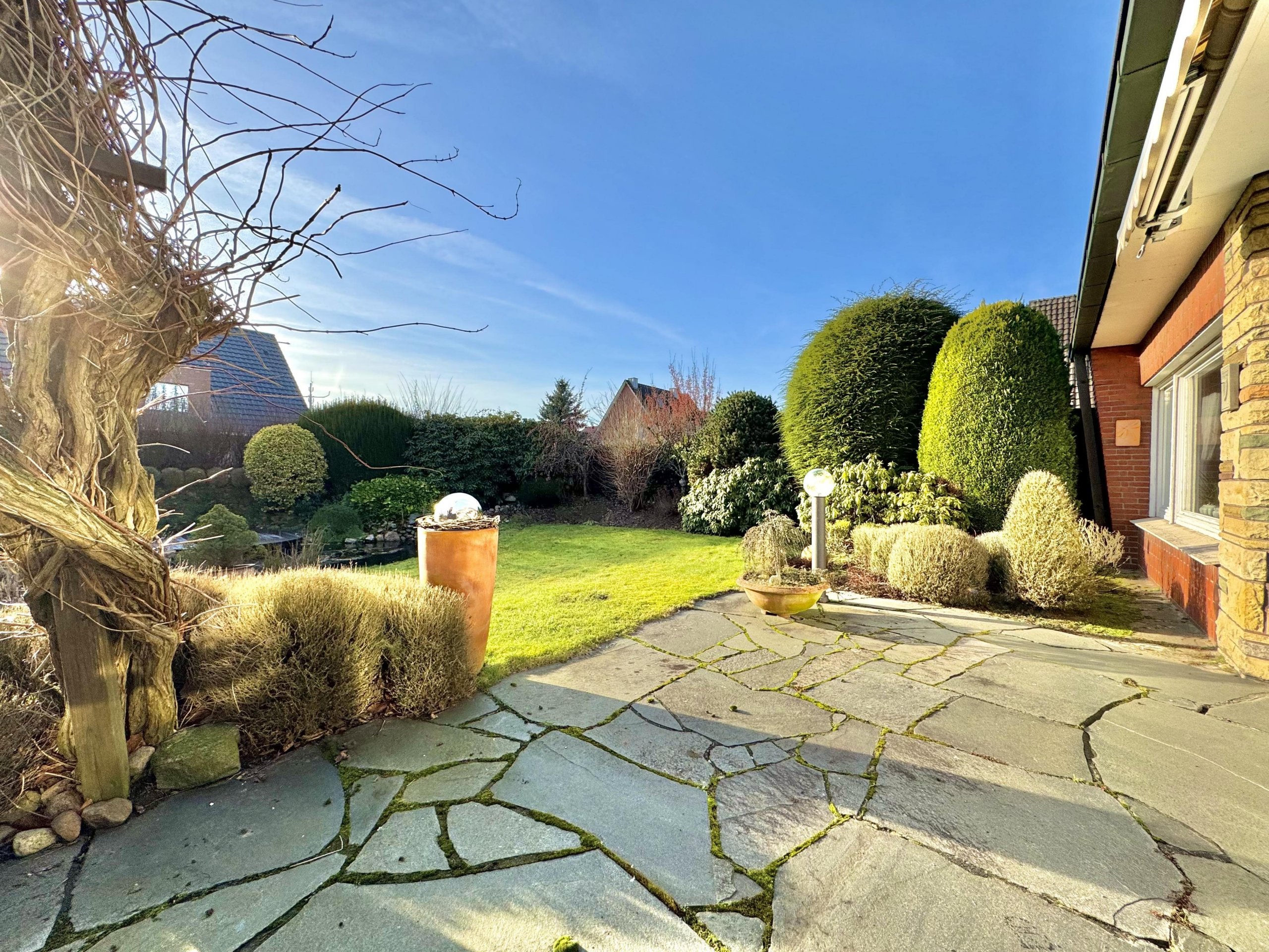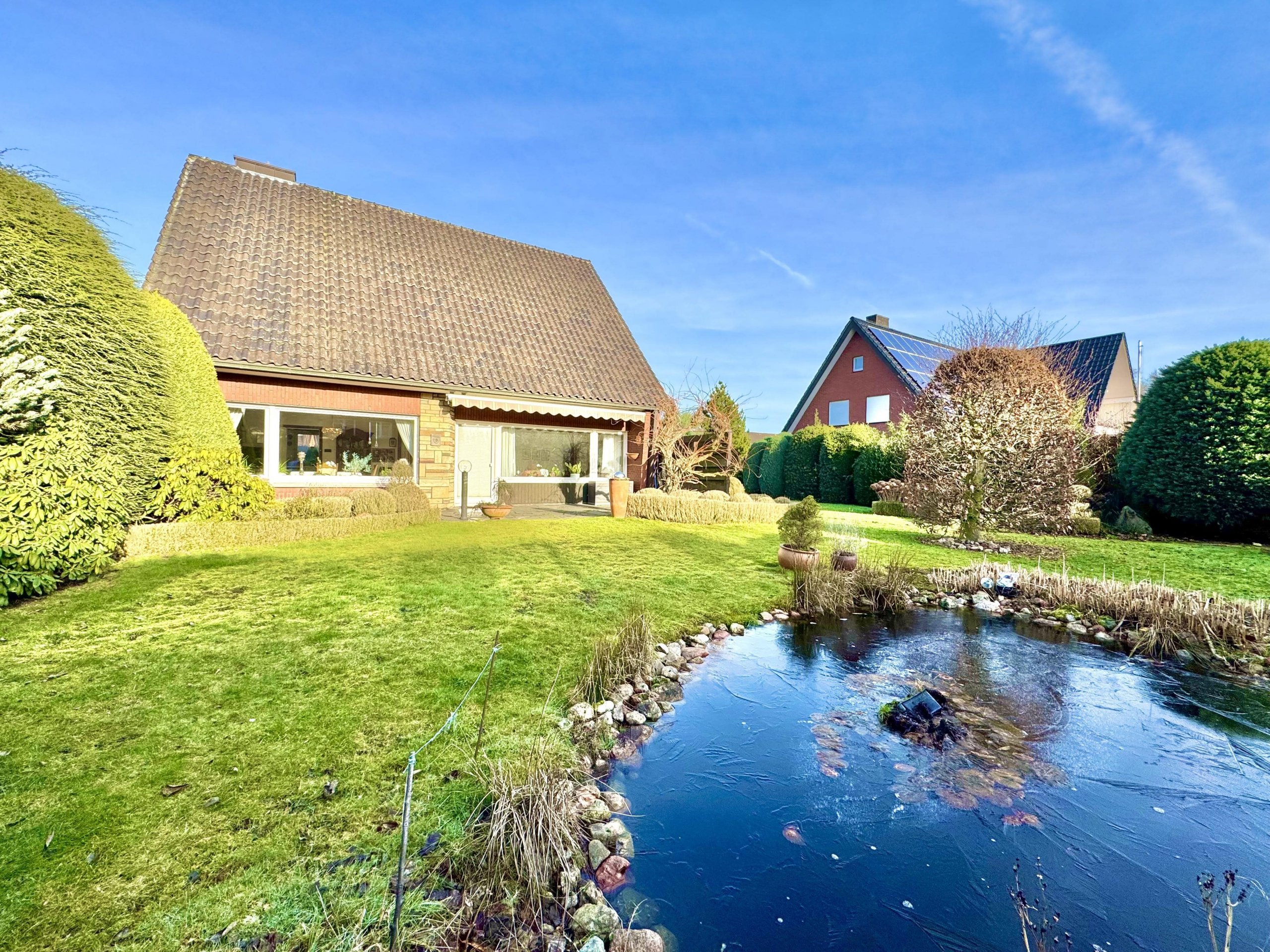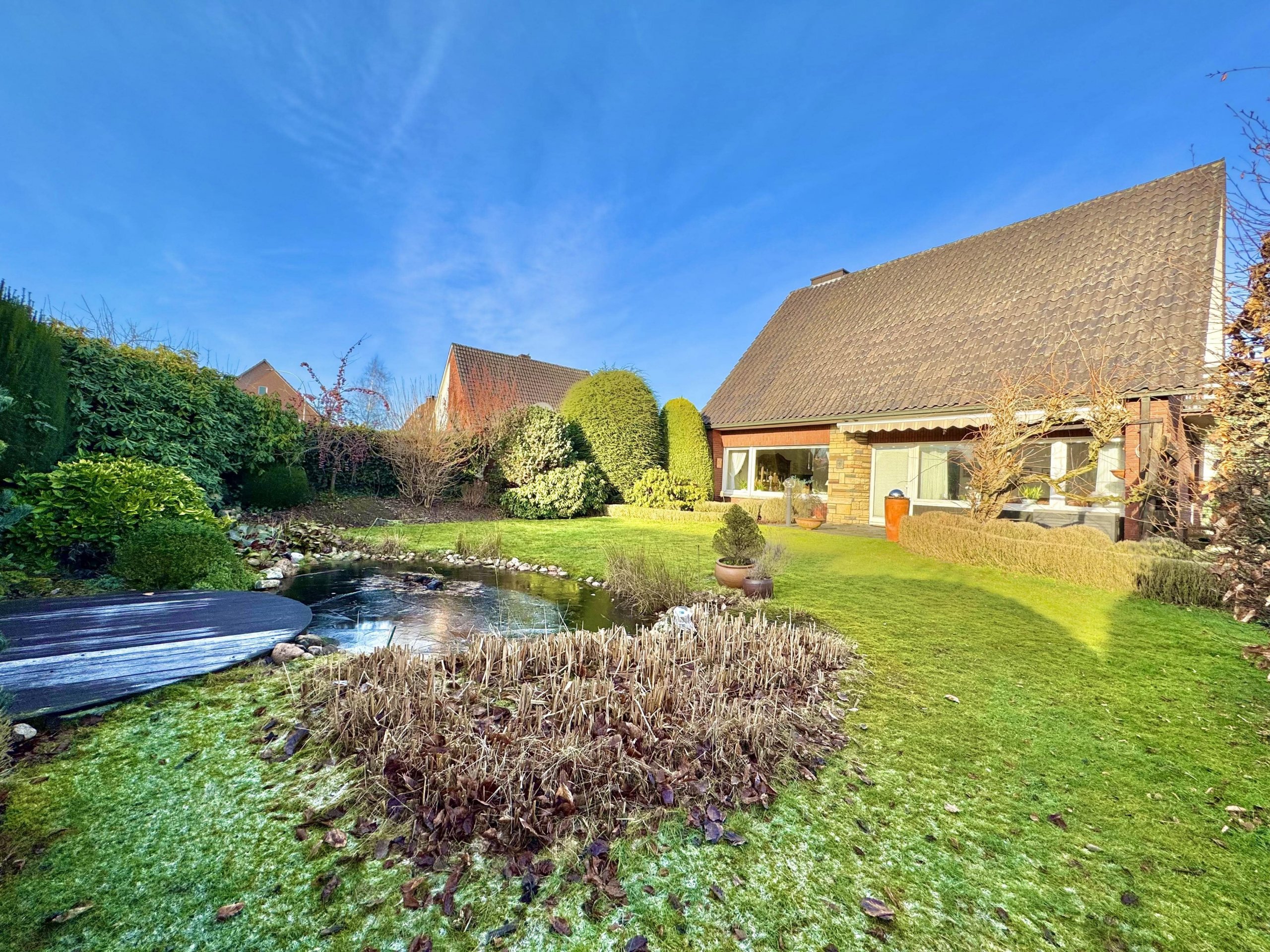 Ein besonderes Highlight ist der große Süd-West Garten. Er ist sorgfältig angelegt, durch eine Hecke geschützt und bietet mit seiner Teichanlage, den gewachsenen Sträuchern und den unterschiedlichen Blickachsen einen hohen Erholungswert. Hier finden Ruhe, Privatsphäre und Natur auf stimmige Weise zusammen.