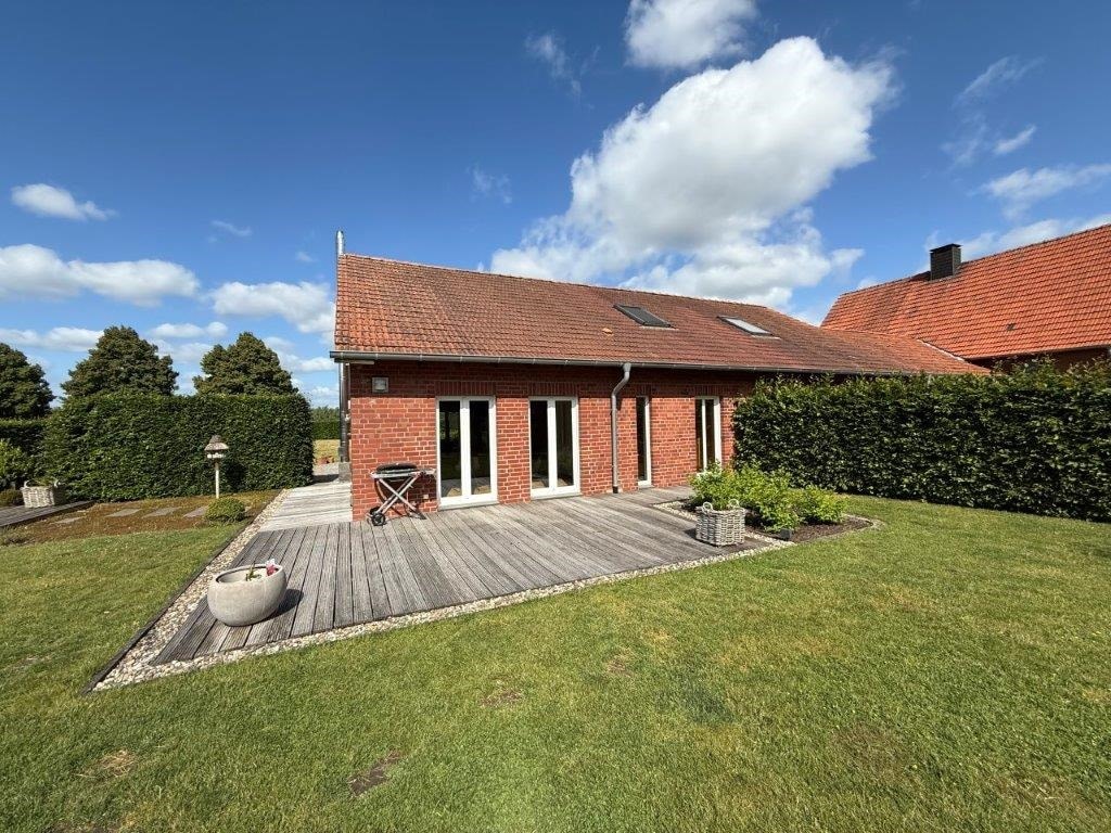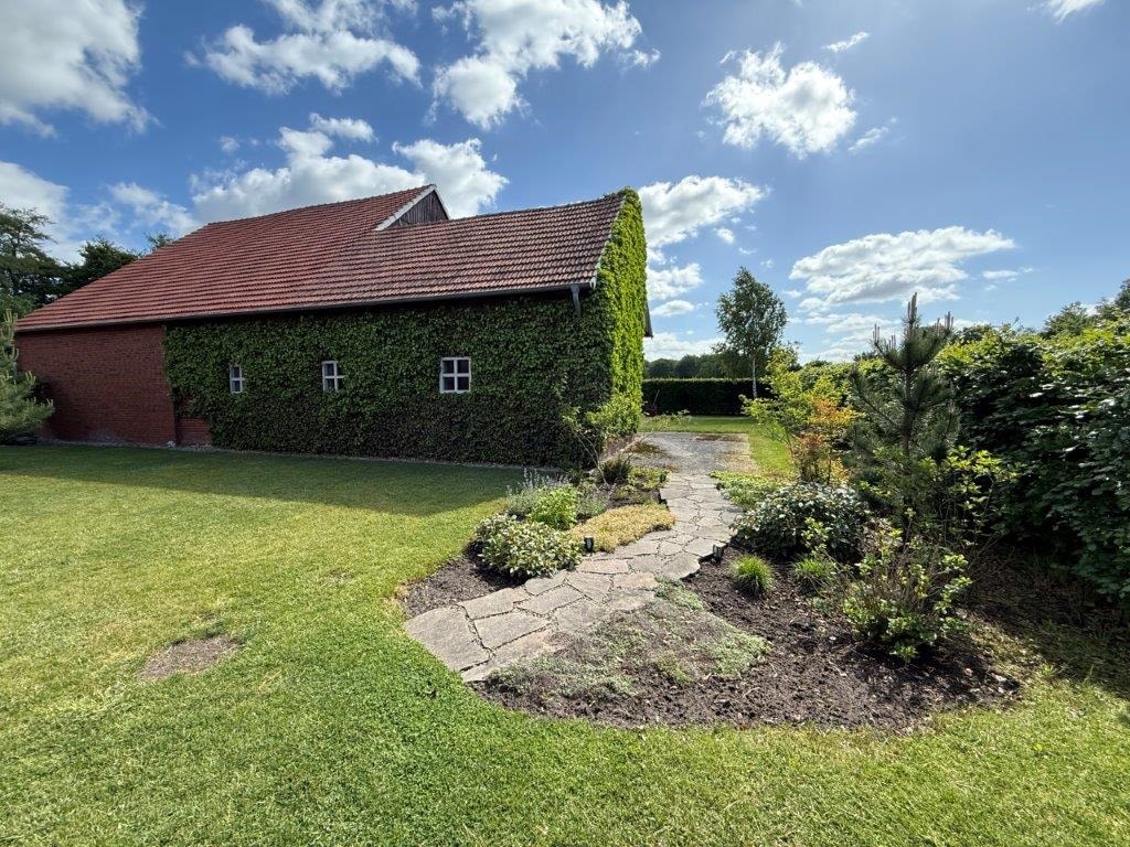 Die zweite Wohneinheit befindet sich im Anbau, Baujahr 2000, sie wurde umfassend modernisiert und präsentiert sich in einem gepflegten, sehr ansprechenden Zustand. Die Wohnfläche verteilt sich hier im Erdgeschoss auf ca. 85 m² und weiteren ca. 38 m² im Dachgeschoss. Ein echtes Highlight im Dachgeschoss ist das großzügige, runde Fenster im Schlafzimmer, das den Raum mit Licht durchflutet und den Blick auf den Coesfelder Berg freigibt, sowie das angrenzende Ankleidezimmer, das zusätzlichen Komfort bietet. Im Wohnzimmer sorgt ein hochwertiger Parkettboden für eine warme Atmosphäre, während der Kamin an kühlen Abenden für Behaglichkeit sorgt. Hier im Wohnbereich eröffnet sich ein herrlicher Blick in den liebevoll angelegten Garten mit Terrassen und einem gepflasterten Weg zur Scheune – Ihr Ort zum Entspannen und Genießen der Natur. Die grüne Umgebung lädt zum Träumen und Verweilen ein. Ob gemütliche Sommerabende mit der Familie oder der Morgenkaffee auf der Terrasse mit Vogelgezwitscher – hier erleben Sie pure Lebensqualität.