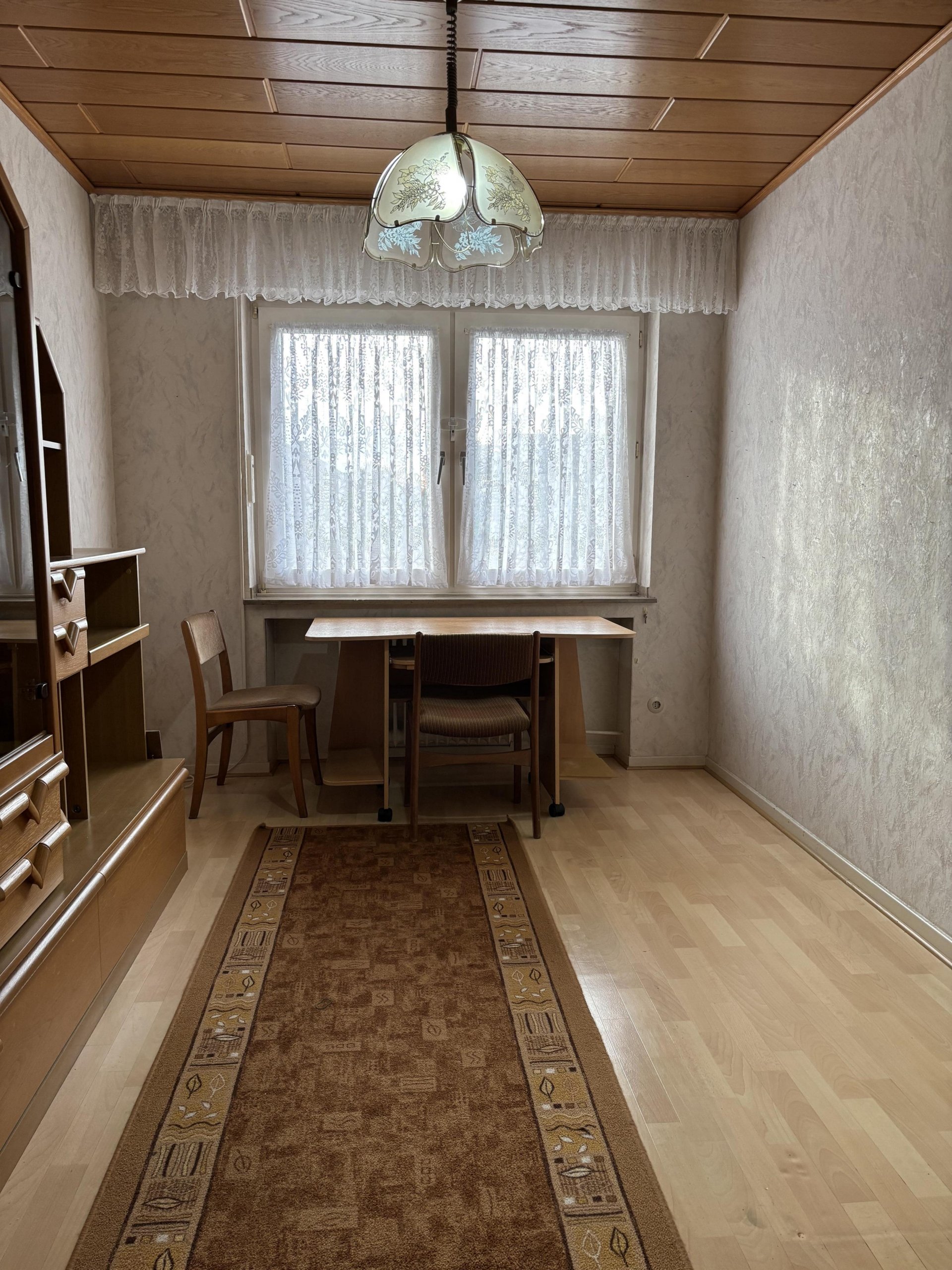 Die Erdgeschosswohnung bietet einen langen Flur, zwei Schlafzimmer, eine Garderobe mit angrenzendem Gäste-WC, ein Tageslicht-Badezimmer, ein helles Wohnzimmer, ein Esszimmer sowie eine Küche mit Ausgang zur überdachten Terrasse und dem gepflegten Garten.