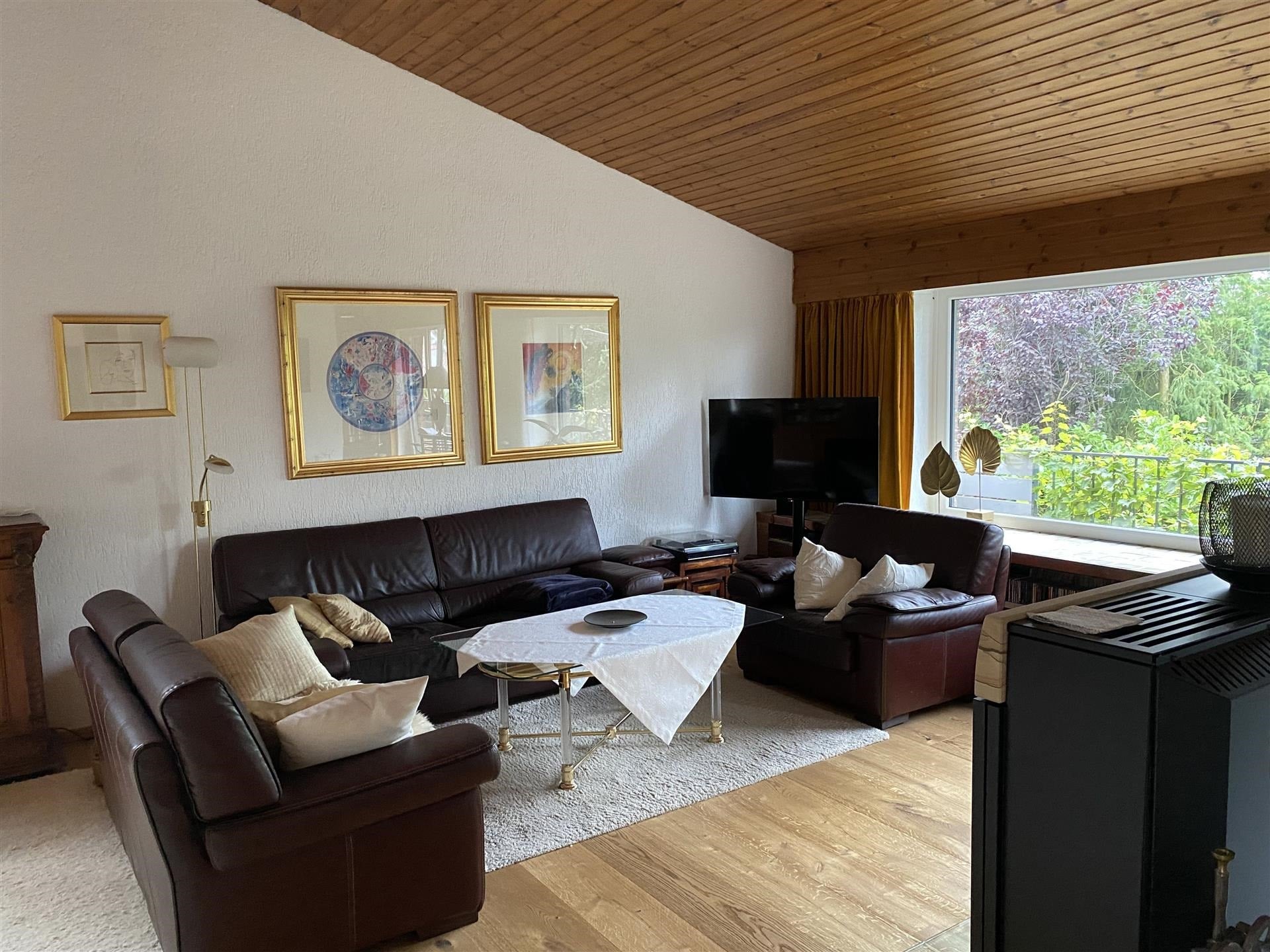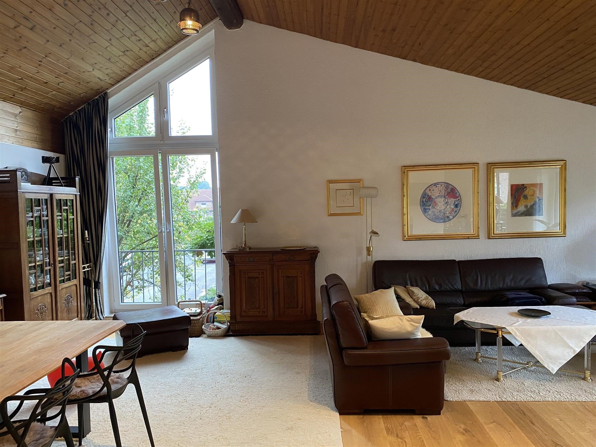Im Obergeschoss erwartet Sie ein Wohnbereich, der durch seine beeindruckende Größe und Gestaltung begeistert. Mit über 60 m² Wohnfläche und einer Deckenhöhe bis zur Dachspitze entsteht ein außergewöhnliches Raumgefühl. Vom Wohnzimmer aus betreten Sie das angrenzende Schlafzimmer mit eigenem Ankleidebereich sowie ein modernes Duschbad. Ein weiterer Höhepunkt ist der große Balkon, den Sie sowohl vom Wohnzimmer als auch vom Schlafzimmer aus erreichen können. Er bietet einen herrlichen Blick in den liebevoll angelegten Garten, der durch seinen alten Baumbestand und die geschickte Bepflanzung nahezu uneinsehbar ist.
