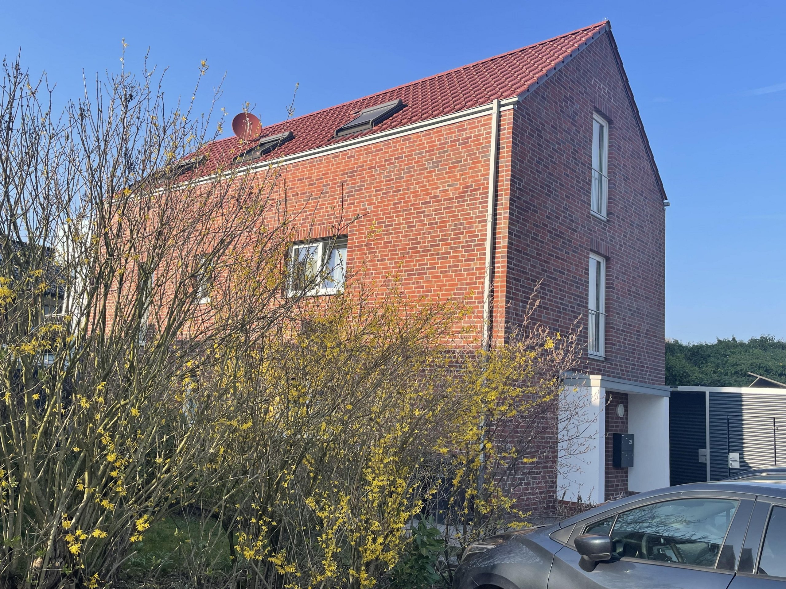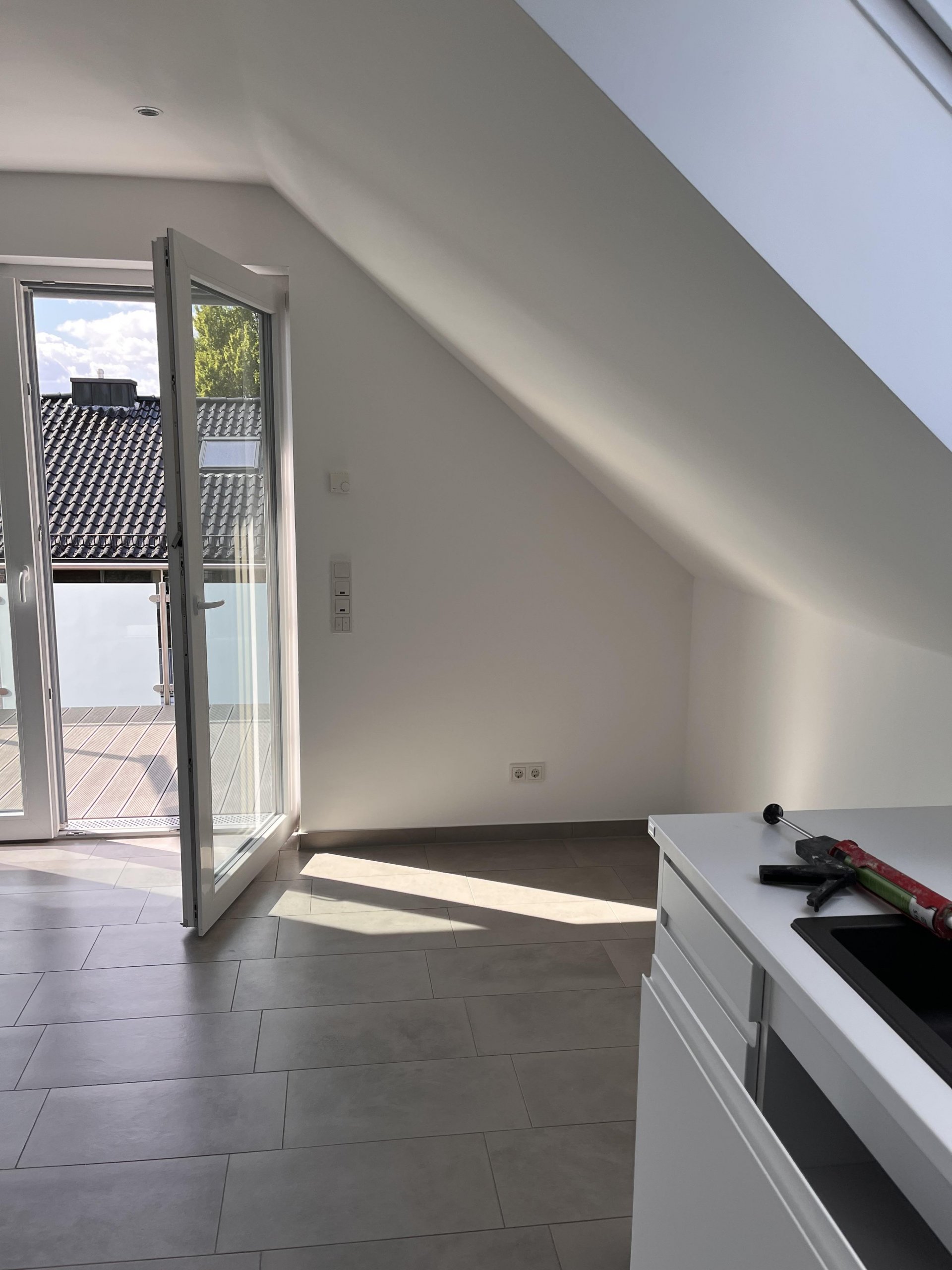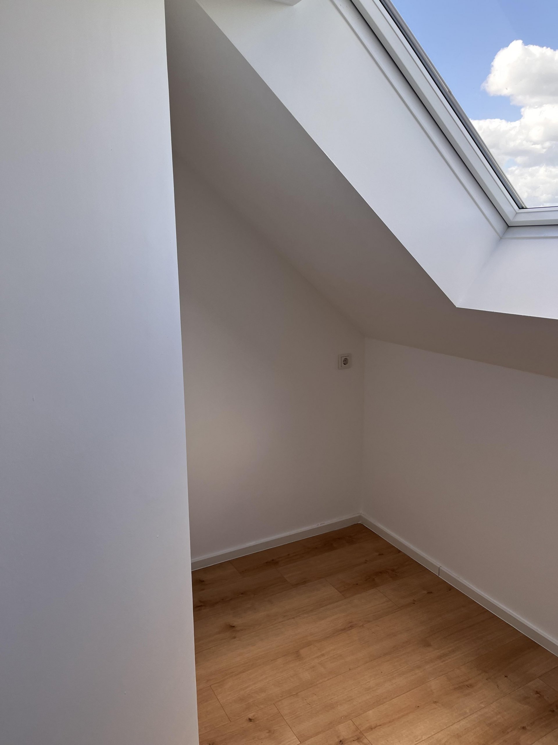 Große Dachflächenfenster sorgen für helle, lichtdurchflutete Räume und schaffen eine angenehme Wohnatmosphäre. Ein besonderes Highlight ist der Balkon mit Markise, der zusätzlichen Wohnkomfort bietet und zum Entspannen im Freien einlädt. Der Abstellraum am Haus (z. B. für Fahrräder) und der PKW-Stellplatz ergänzen dieses durchdachte Wohnkonzept.