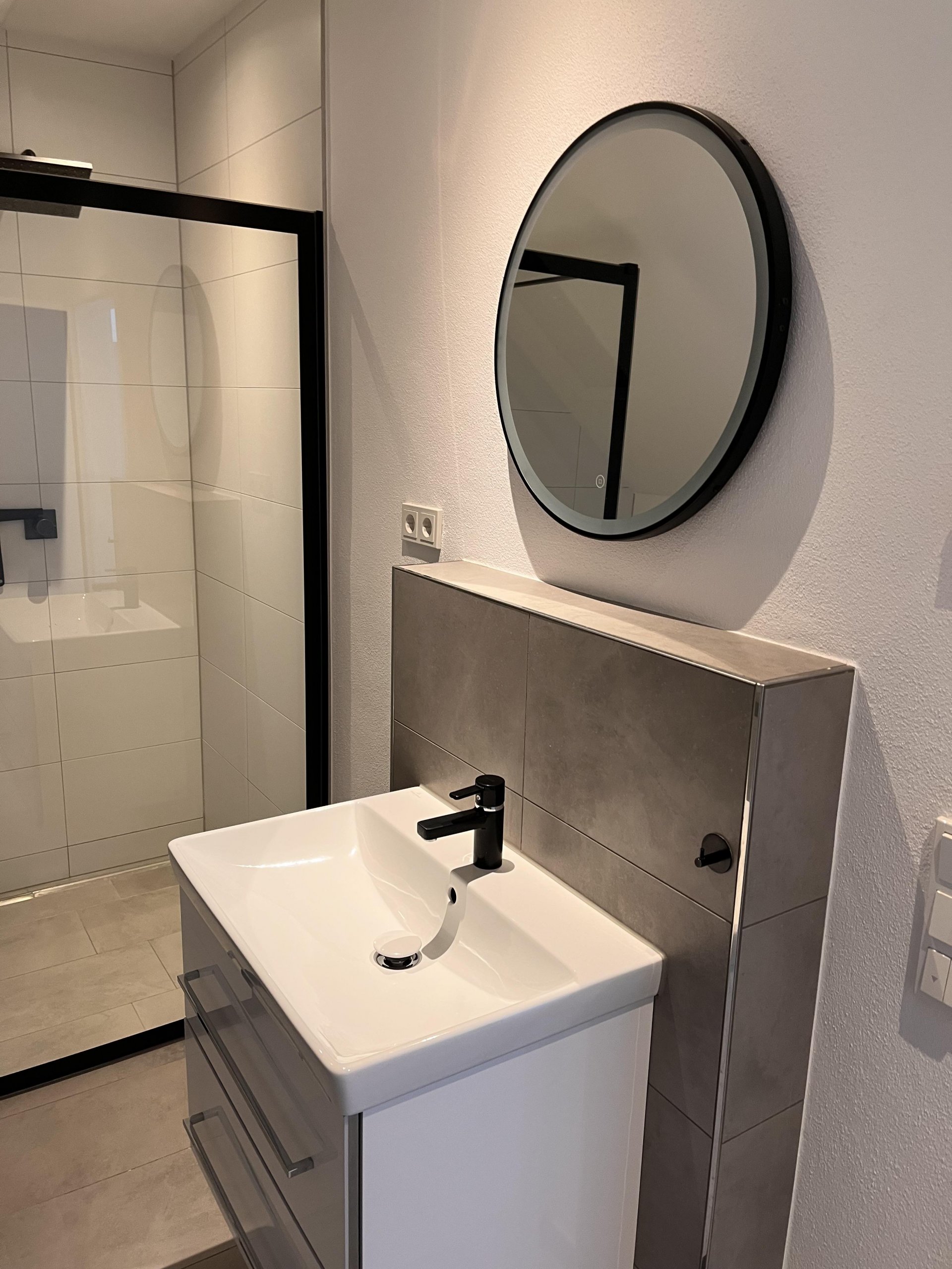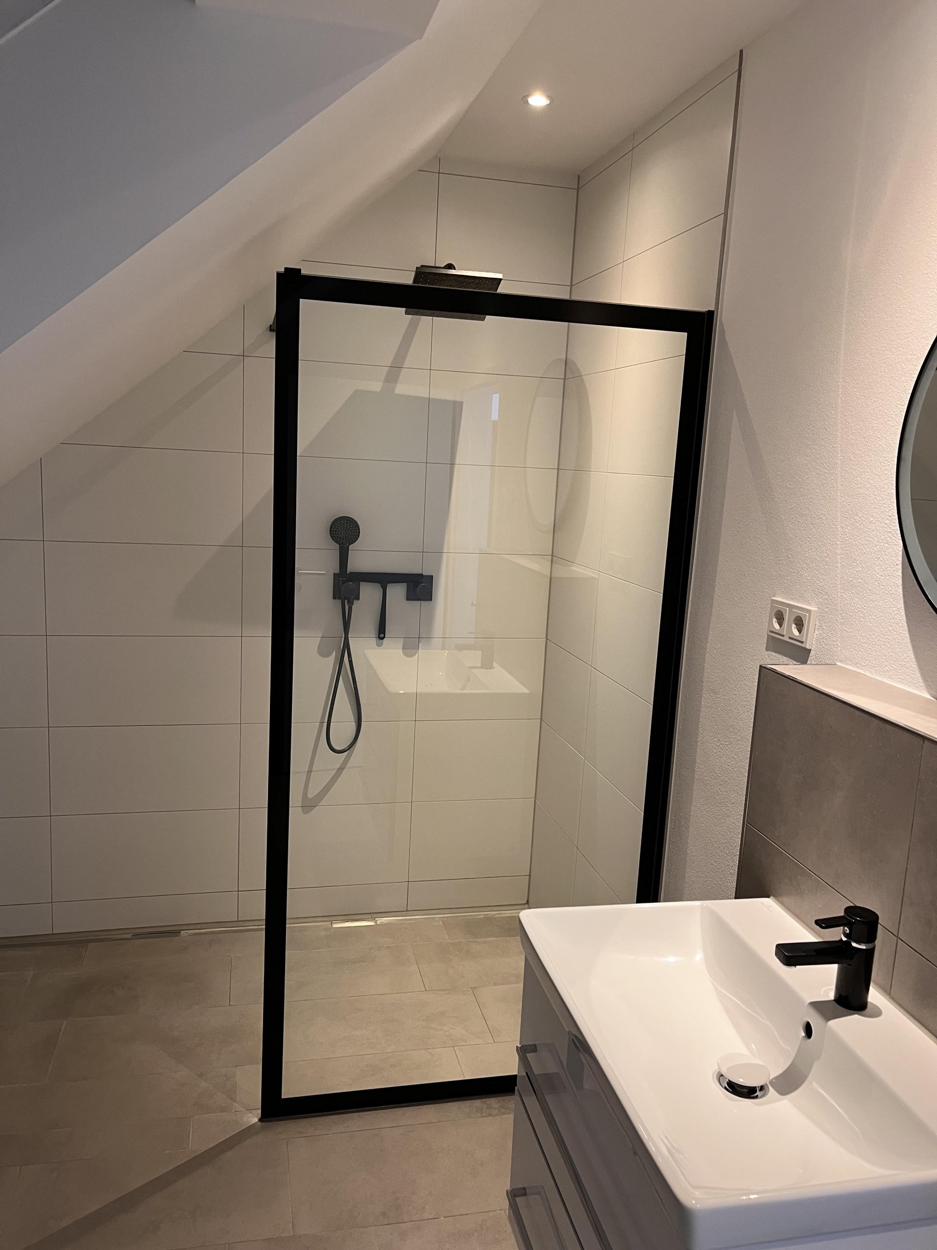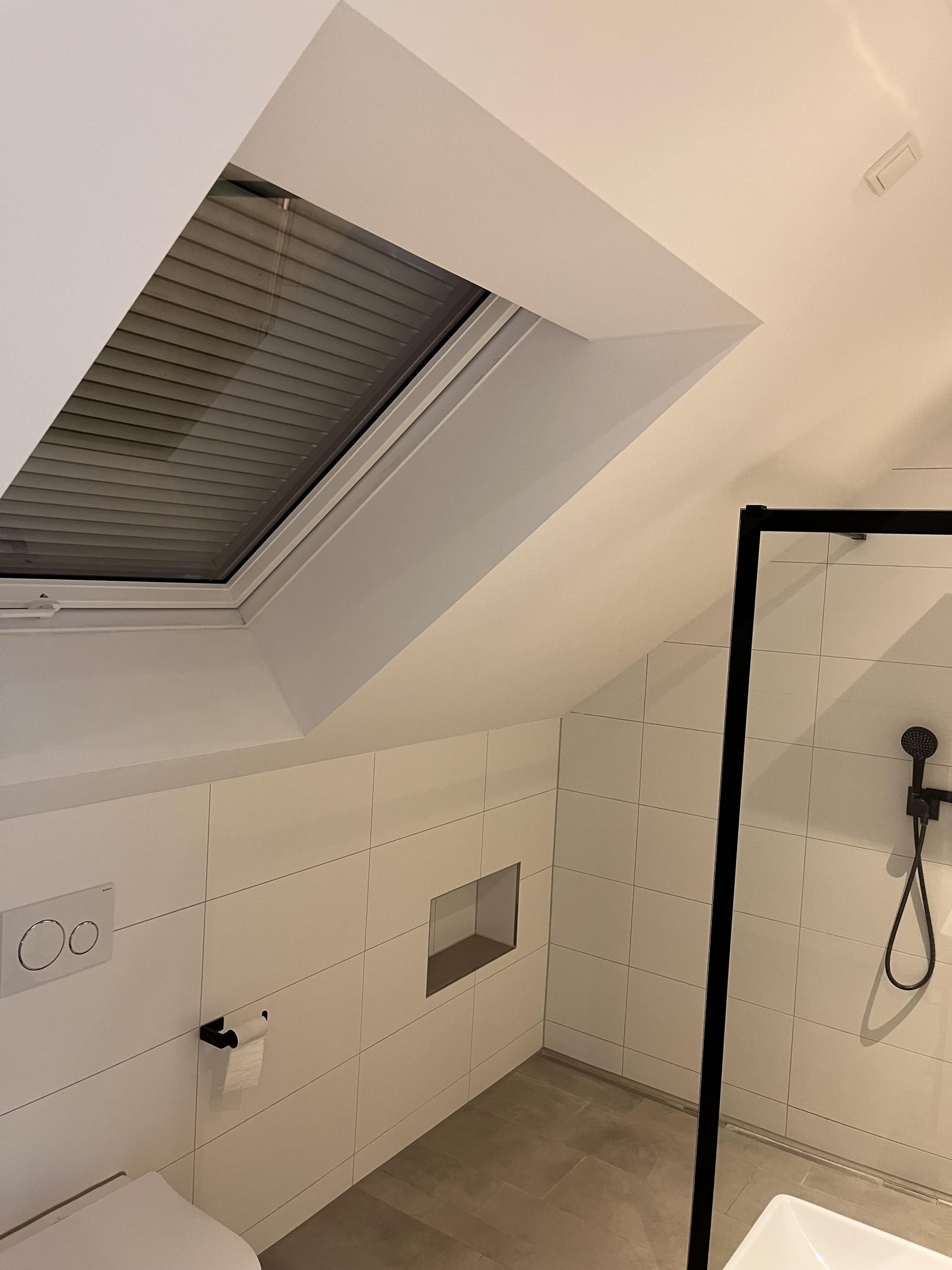- modernes Bad mit bodenebener Dusche und Fenster