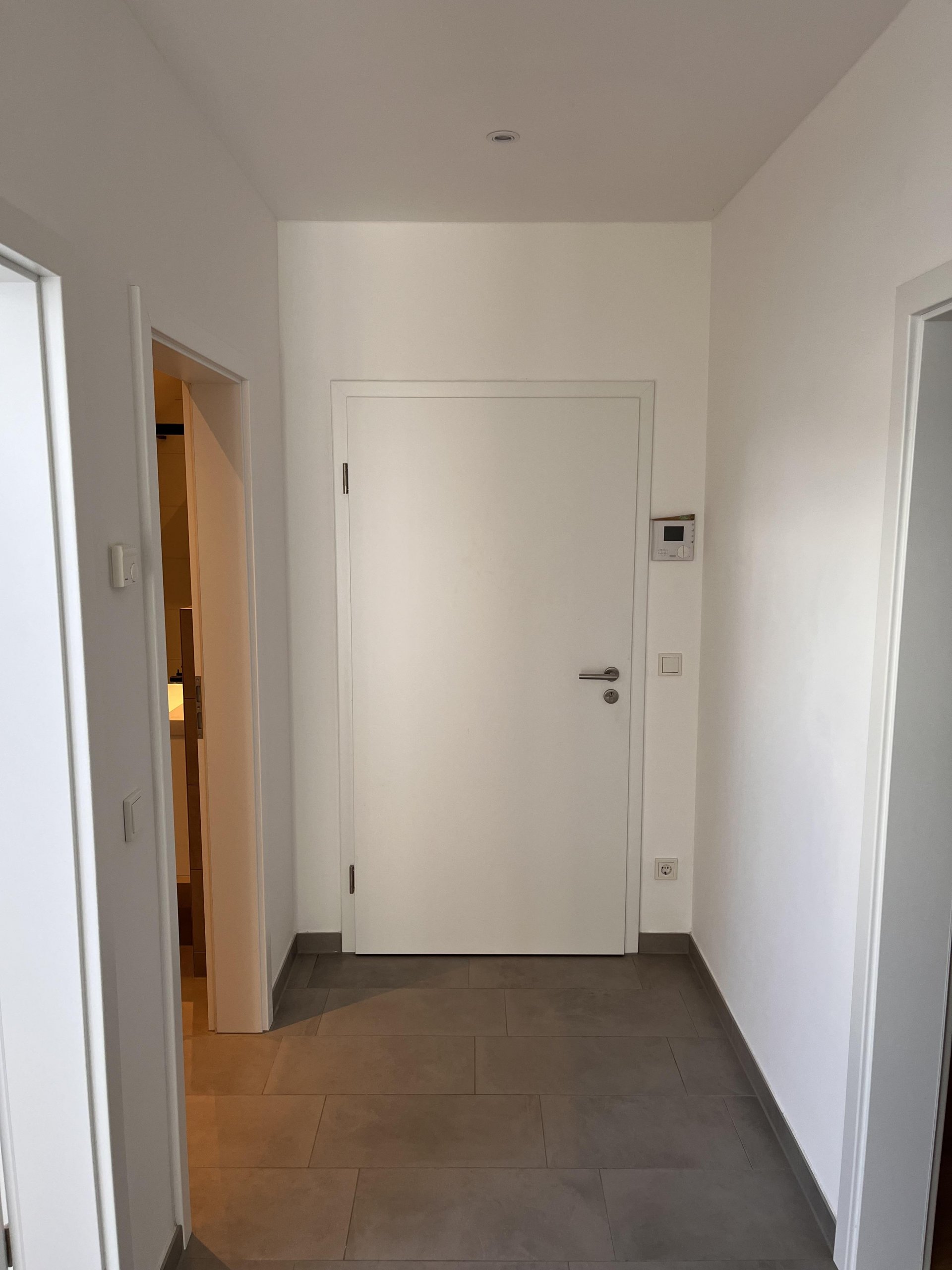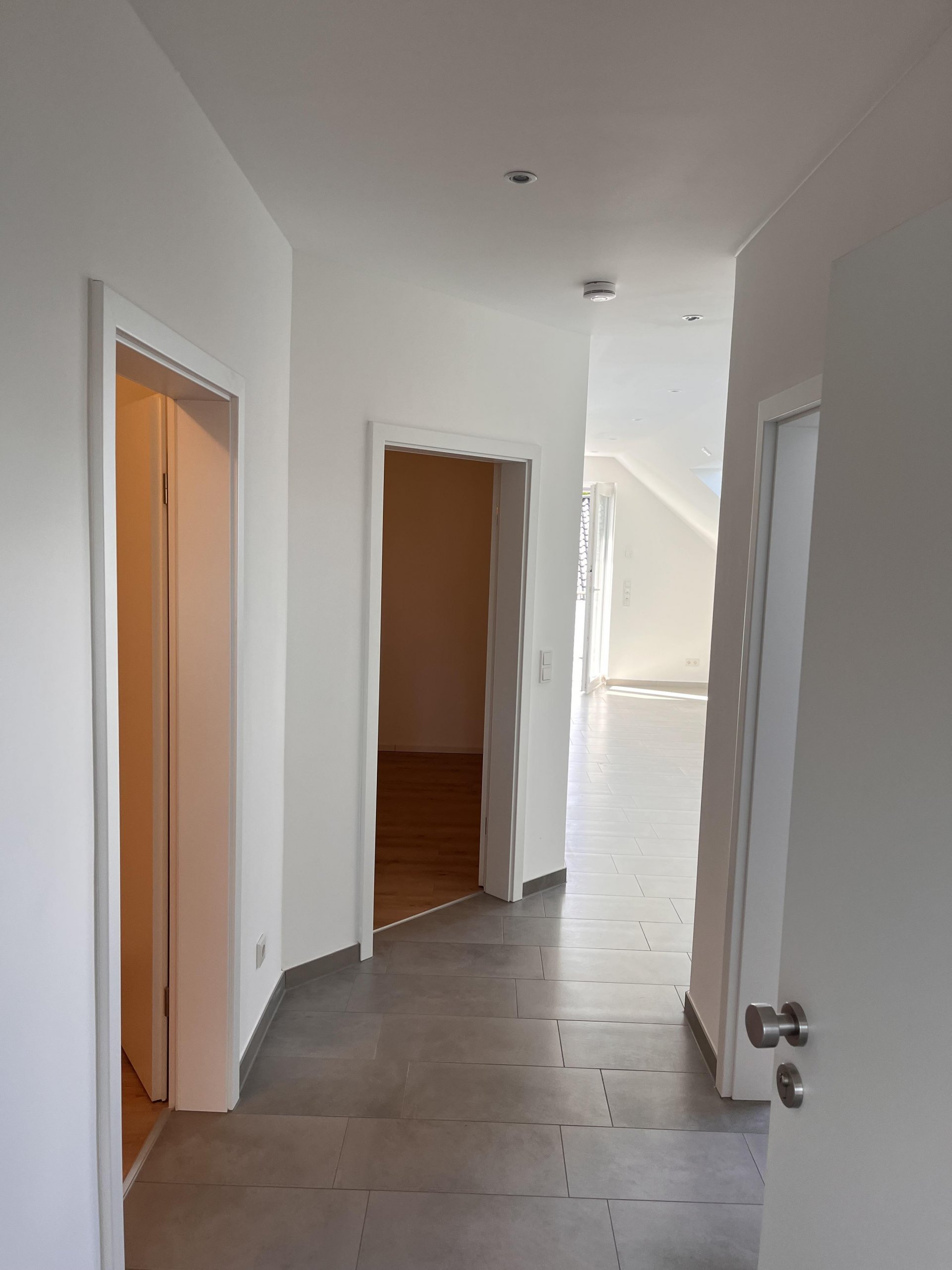 graue Fliesen in Diele, Bad, Wohn-/Esszimmer und Küche
