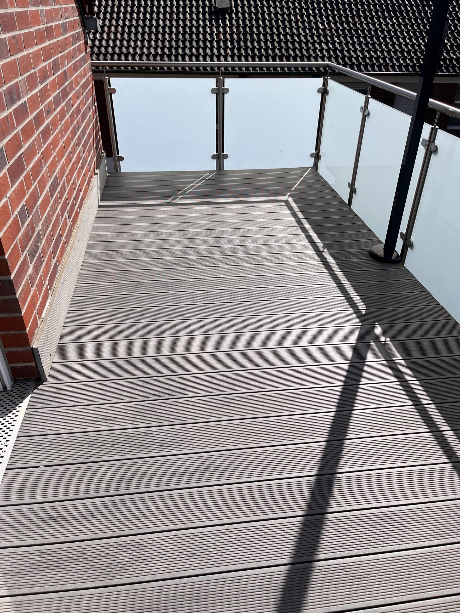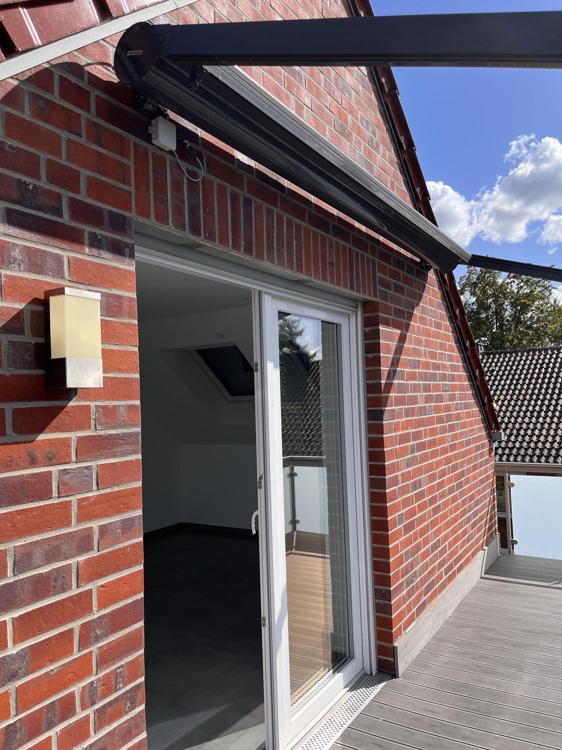 Balkon mit WPC-Dielen, Markise und Balkongeländer aus Glas