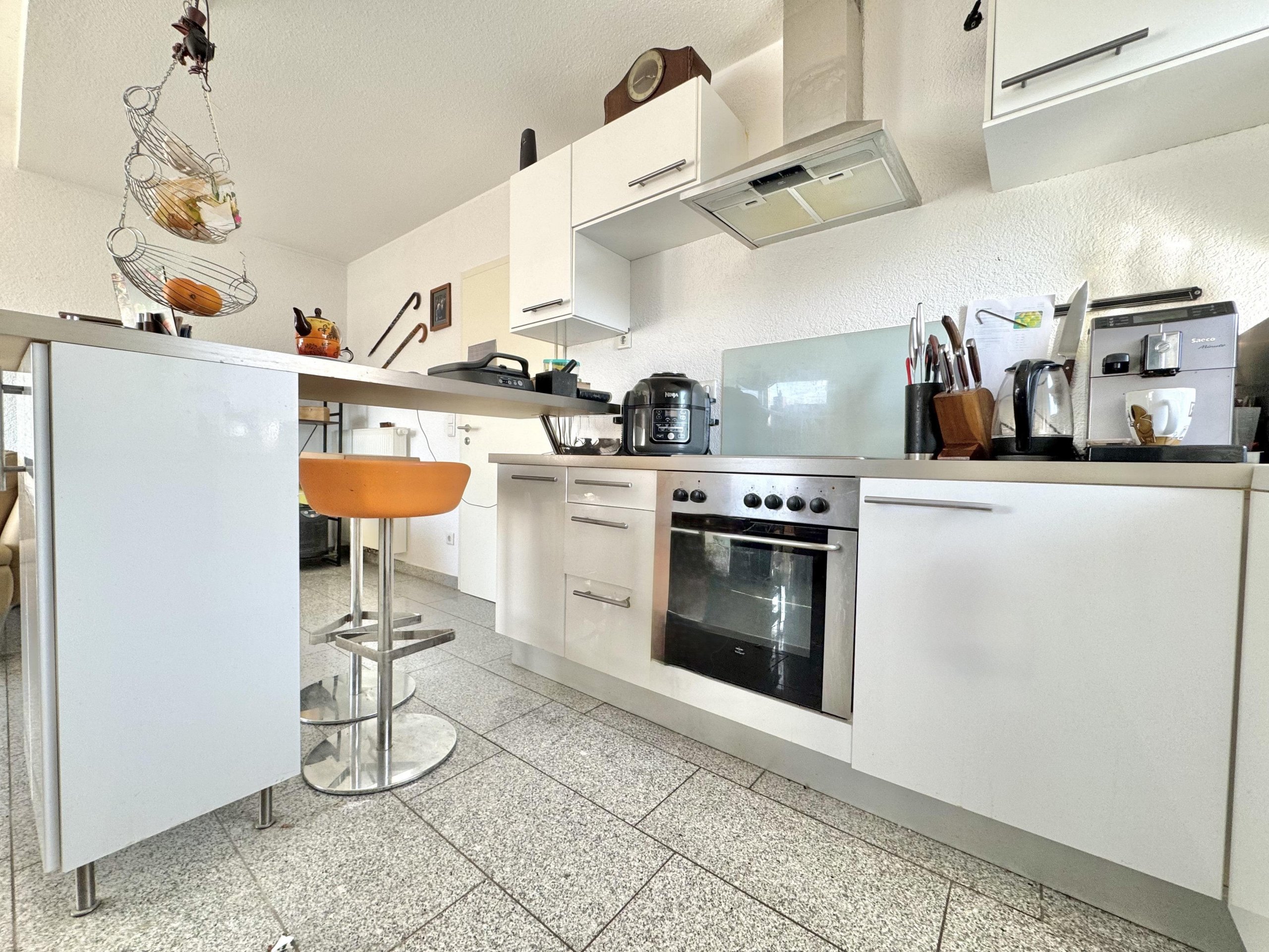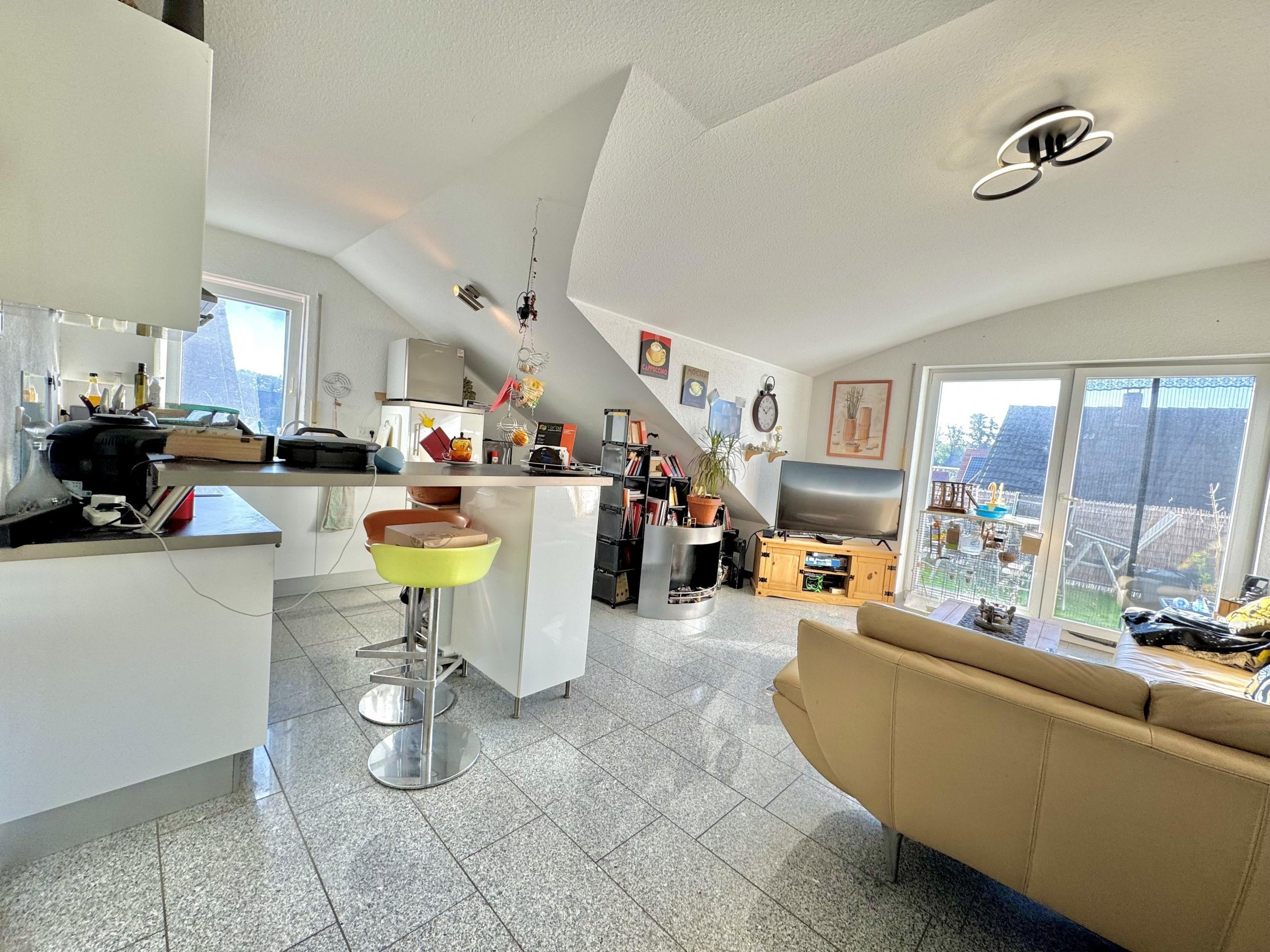 - Wohnzimmer mit offener Küche und Zugang zum Balkon